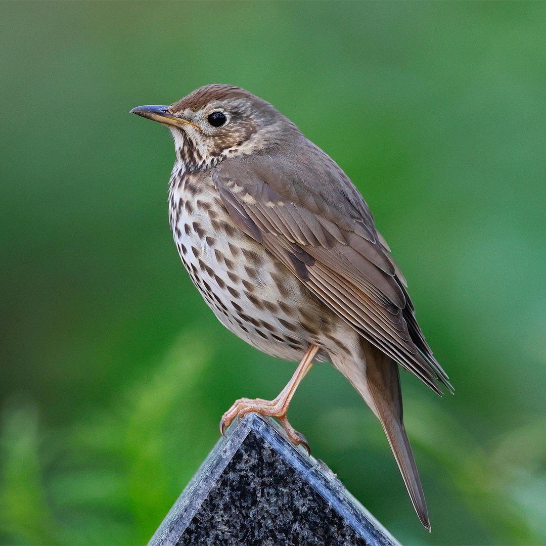 Il tordo ha il dorso bruno, petto macchiettato, area inferiore delle ali beige e coda marrone uniforme.
